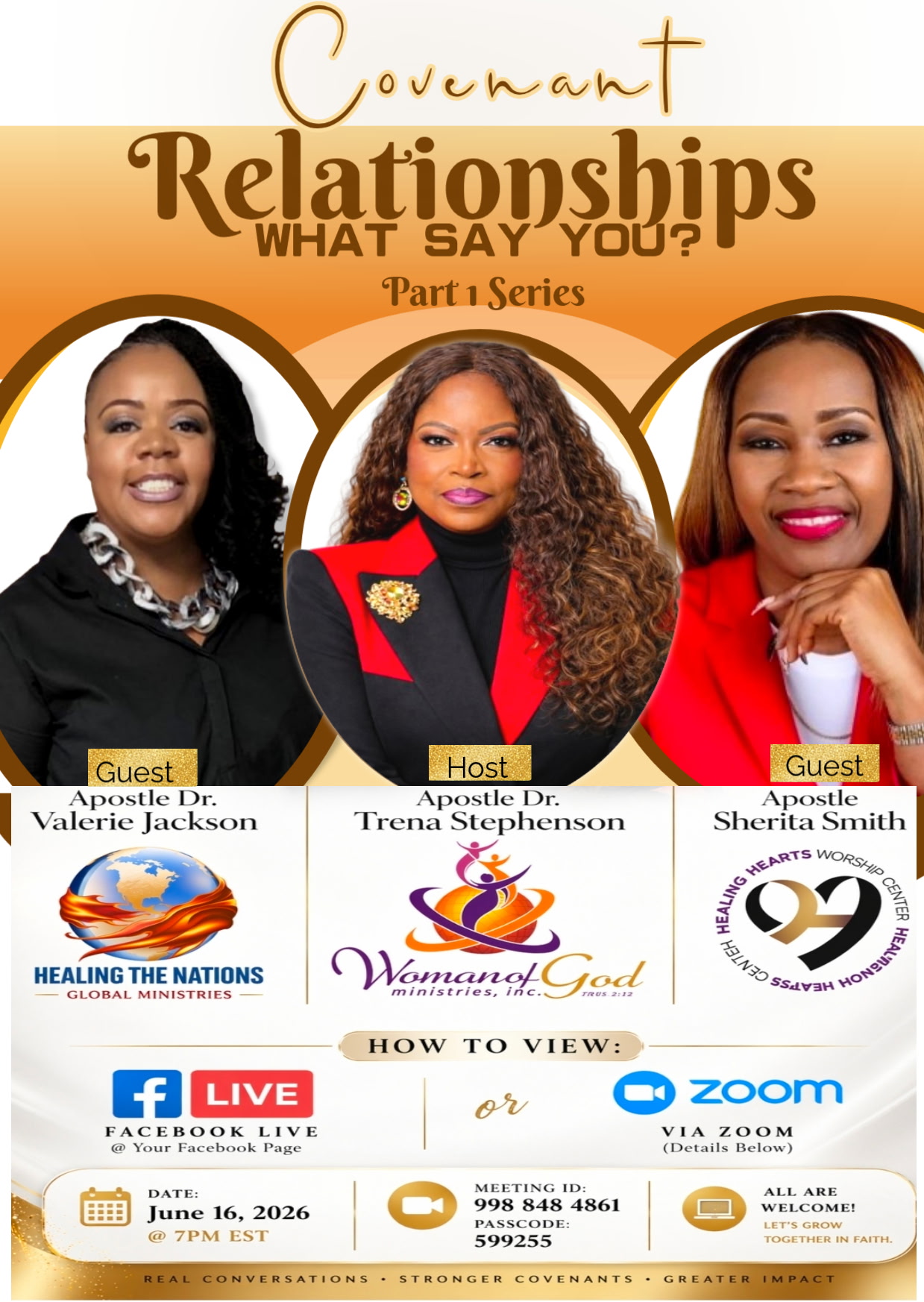 Apostle Trena D. Stephenson is an exceptional Kingdom Leader with a global mandate on her life and a prophetic oil that is ancient and far reaching in its depth, sound dimension and accuracy. As the covering organization of Woman of God Ministries, Inc. we highly recommend her professional integrity, spirtual maturity and biblical authenticity -as she launches this upcoming School of the Prohets: both Onsite & Online Training in Spring 2020! After investing in this time of extraordinary insight, revelation and instruction; you will soar with fresh prophetic wings and go to new heights of clarity and confidence. So prepare to take off on this Christ-centered, Spirit-inspired and
